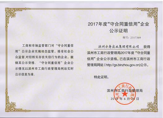 近日,我公司順利通過濱州市工商行政管理局審核,獲得2017年度市級“守合同重信用”企業公示資格。我公司自2007年以來,連續多年獲得市級“守合同重信用”企業榮譽稱號。